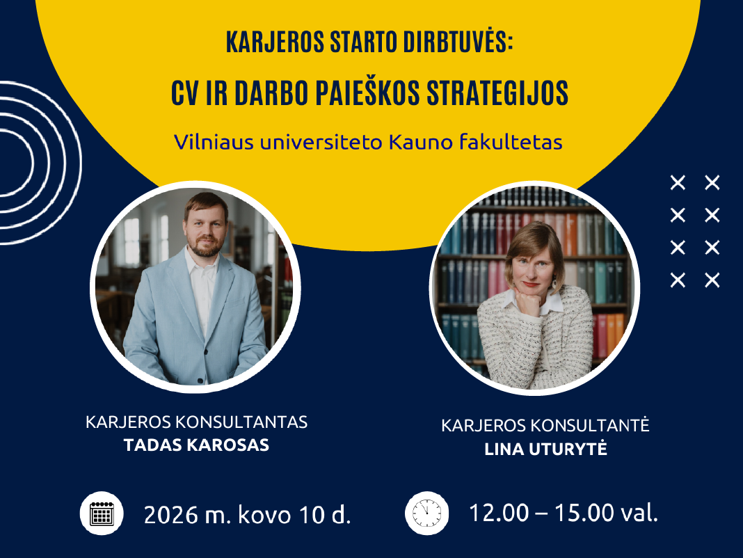 VU Karjeros centro komanda kviečia studentus į praktinius mokymus „Karjeros starto dirbtuvės: CV ir darbo paieškos strategijos“, kurie vyks kovo 10 d. 12:00–15:00 VU Kauno fakultete (VK studijoje).