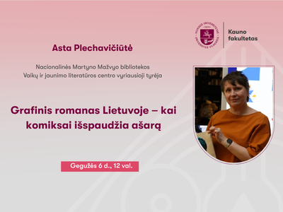 Nacionalinės Martyno Mažvyo bibliotekos Vaikų ir jaunimo literatūros centro vyriausiosios tyrėjos Astos Plechavičiūtės paskaita „Grafinis romanas Lietuvoje – kai komiksai išspaudžia ašarą“