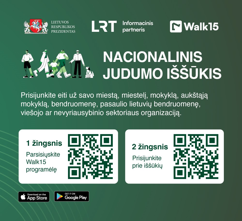 Lietuvos Respublikos Prezidentas Gitanas Nausėda jau penkti metai kviečia puoselėti aktyvumą ir darnų judumą. Norintieji dalyvauti turi savo telefonuose įsidiegti nemokamą programėlę „Walk15“, kurioje laukia net aštuoni iššūkiai, tarp jų – ir Aukštųjų mokyklų iššūkis.