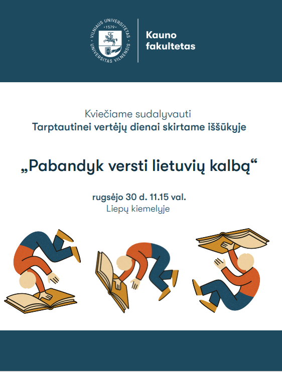 Rugsėjo 30 d., antradienį, 11.15 val. Liepų kiemelyje Vilniaus universiteto Kauno fakulteto bendruomenės nariai, studentai ir visi norintieji kviečiami dalyvauti tarptautinei vertėjų dienai skirtame renginyje „Pabandyk versti lietuvių kalbą“.
