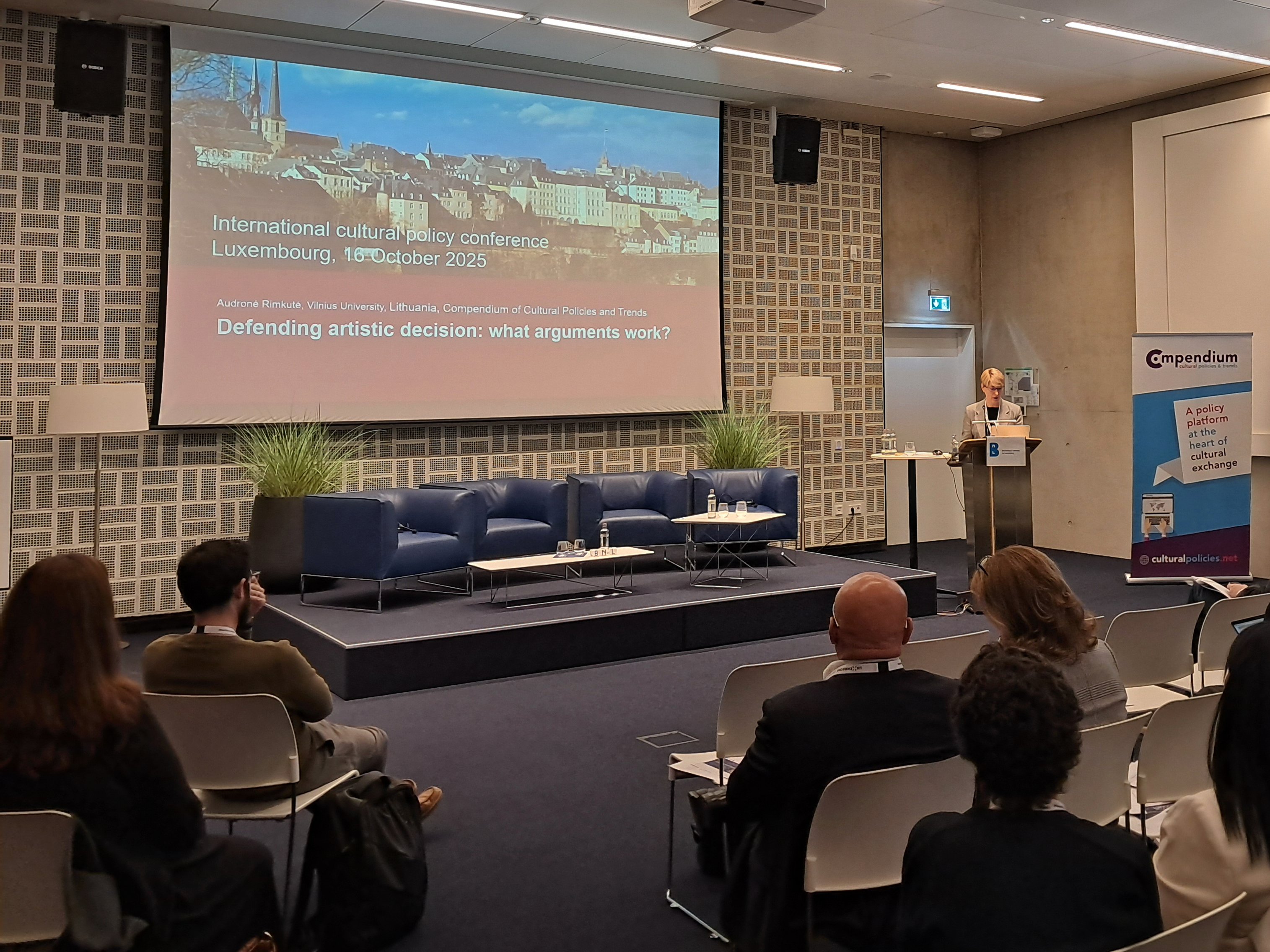 Spalio 16–17 d. Vilniaus universiteto Kauno fakulteto (VU KnF) Meno vadybos magistro programos komiteto pirmininkė doc. dr. Audronė Rimkutė dalyvavo tarptautinio kultūros politikos tinklo „Compendium of Cultural Policies & Trends“ narių suvažiavime Liuksemburge ir su Liuksemburgo kultūros ministerija ir Nacionaline biblioteka organizuotoje tarptautinėje konferencijoje „¡Watch it! – Freedom of Artistic Expression. Cultural Policies for Democracy“. Pirmojoje konferencijos dalyje, skirtoje meninės saviraiškos laisvės ir jos situacijos Europos šalyse analizei, mokslininkė skaitė pranešimą „Defending Artistic Decisions: What Arguments Work?“, kuriame pristatė kokybine atvejų analize paremtą kūrybos laisvės situacijos Lietuvoje apžvalgą.