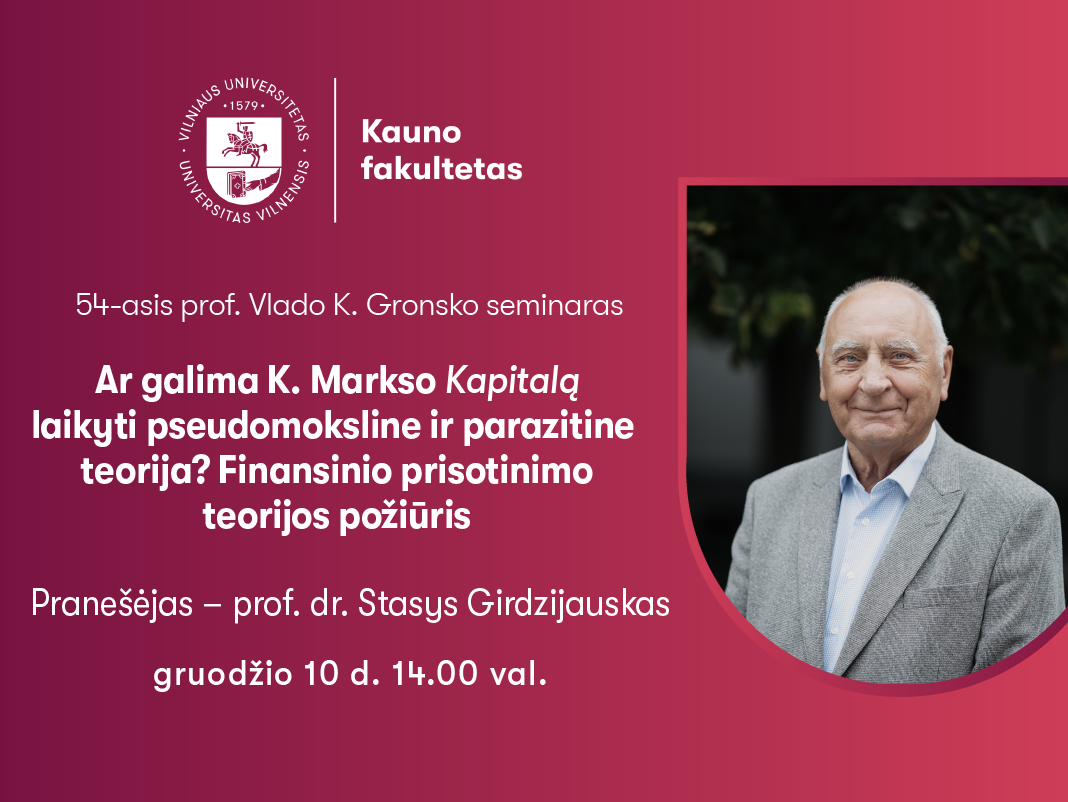 Penkiasdešimt ketvirtasis seminaras įvyks 2025 m. gruodžio 10 d. 14.00 val. (V aud.). Jo tema „Ar galima K. Markso Kapitalą laikyti pseudomoksline ir parazitine teorija? Finansinio prisotinimo teorijos požiūris“.